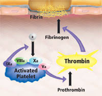 - activated factors form on PLT surface, making the tenase complex (F9a, F8a, & substrate F10), which in turn provides materials for the prothrombinase complex (10a & 5a), generating thrombin burst, ultimately forming fibrin from fibrinogen.