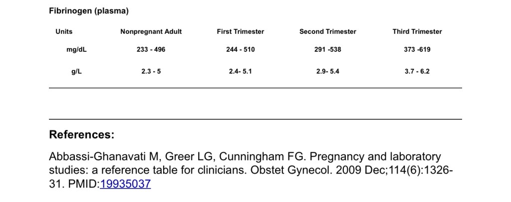 - Coagulation activity is basically doubled in pregnancy, leading to hypercoagulable state. Despite this, COAGS: PT/aPTT/INR lab values remain normal or only slightly decreased. Fibrinogen however, is tripled to 450-600 by term.
