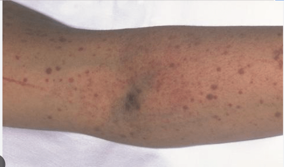 - mucosal bleeding (nose, GI, urine) and subcutaneous bleeding (oozing IV sites, easy bruising)