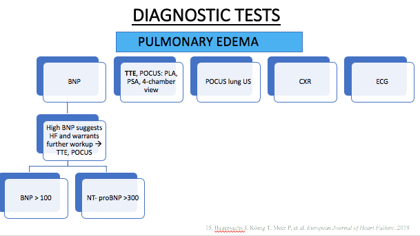 - TTE is a BASIC, NECESSARY assessment tool for pulmonary edema to rule out cardiac causes and guide treatment. If TTE unavailable, at LEAST draw BNP to assess for cardiac strain/overload. Elevated BNP in pregnancy generally indicates cardiac etiology: PPCM. (BNP lab values are UNCHANGED in normal pregnancy.)