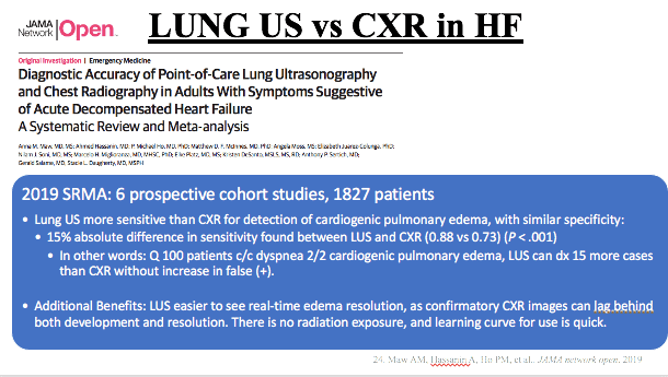 - Lung US technically is more sensitive than CXR to detect pulmonary edema and track progression or improvement, we’re still getting CXRs fam, but for initial quick diagnosis, LUS is faster, more accurate, and can better track resolution.