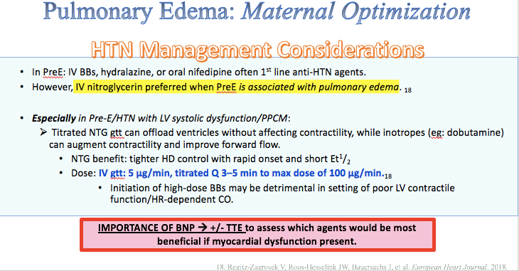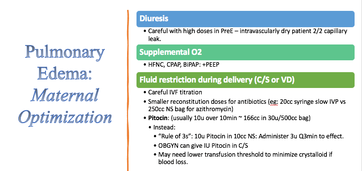 Pts with HTN disorders of pregnancy need more specialized attention – shown to have higher incidence of ICU-level care. More PreE w SF pts should probably have routine ECHO during pregnancy/antenatal. Especially considering long-term implications of CV risk later in life 2/2 PreE. BUT ESPECIALLY** IF THEY COME IN WITH PULMONARY EDEMA/ NEW SYMPTOMS OF CARDIOPULMONARY DYSFUNCTION!!
