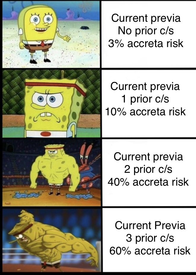 - Placenta previa is a huge risk factor for accreta (discussed in detail below)
