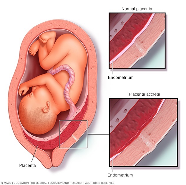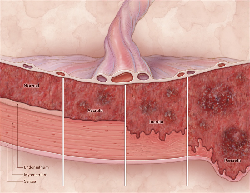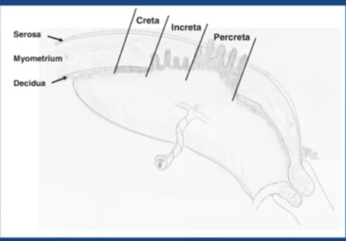 - The cause of accreta is debated – old thoughts were it was an over-aggressive placental trophoblastic invasion through the decidua to the myometrium. But new thoughts are it may more of a problem w the decidua itself where it doesn’t form properly and the placenta attaches to the next logical place – the myometrium.