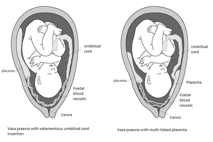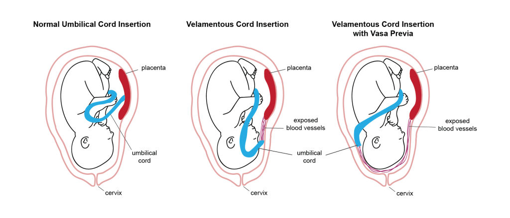 - Tiny stringy vessels abnormally connecting umbilical cord to placenta (aka velamentous cord insertion) will easily be compressed and can rupture, leading to fetal exsanguination and death .. at the very least cut off fetal blood flow (O2) with contractions/fetal descent.