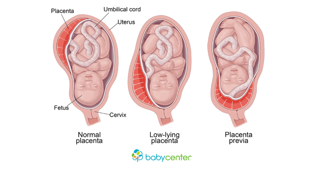 - Previa = Problem with placental location: attached low on uterus and covers all, or part of, the cervical os.