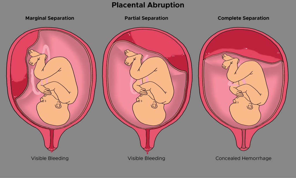 - Abruption is when the placenta detaches from the uterine wall. This detachment impairs fetal blood/O2 delivery, and mom can lose a ton of blood as she hemorrhages into this retroplacental space. Hemorrhage can be visible or concealed.