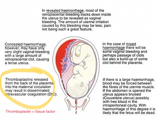 - Although the the hallmark is painful vaginal bleeding – abruption can be completely concealed with no visible vaginal bleeding – and depending on the size and characteristics of the abruption – pain can vary. So as soon as the OBGYN diagnoses/suspects abruption based on other parameters/FHR strips/clinical indicators —> The plan changes and new labs are needed to see where we are along this potential DIC pathway.