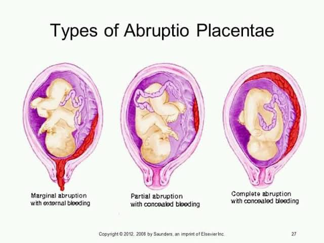 - CONCEALED abruption = no visible bleeding as concealed hemorrhage and retroplacental clot continues forming behind placenta. Pt will c/o pain. Can be mistaken for contractions but pain continues after cxn subsides. OBGYNs can also tell the difference based on FHR and other s/s.