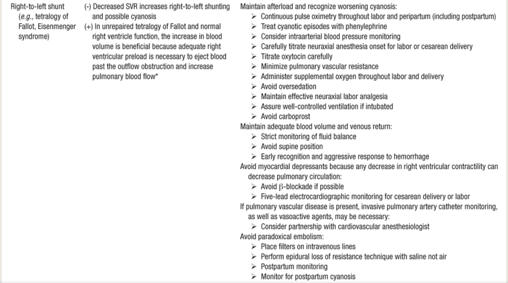 - Vaginal delivery not absolutely contraindicated, but not ideal – assc w/ vol changes during cxns —> problematic bc right heart can’t increase C.O. to accommodate vol changes. Also pushing can have adverse hemodynamic effects. And a stat c/s would be a shitshow lose/lose situation.