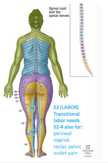 - 2nd stage of labor eventually involves dermatomes S2 – S4 (pudendal nerve).