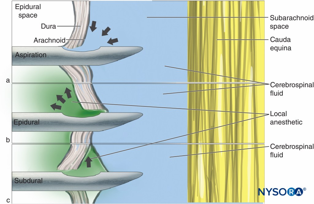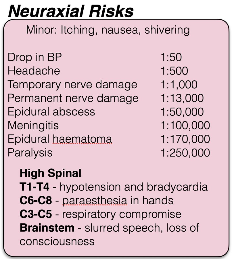- Spinal: – 1/1000 headache risk from dural puncture.