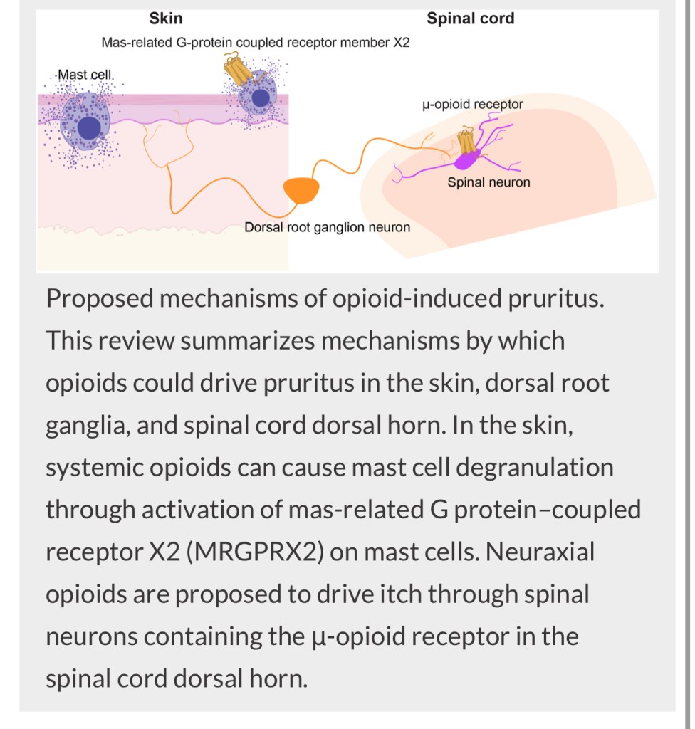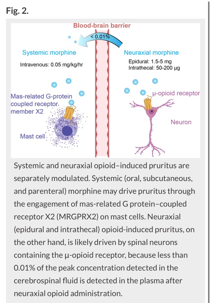 With intrathecally administered opioids (10 mcg fent, 100 mcg duramorph) systemic absorption is negligible & unlikely to have peripheral mast-cell-mediated pruritis, rendering Benadryl ineffective.