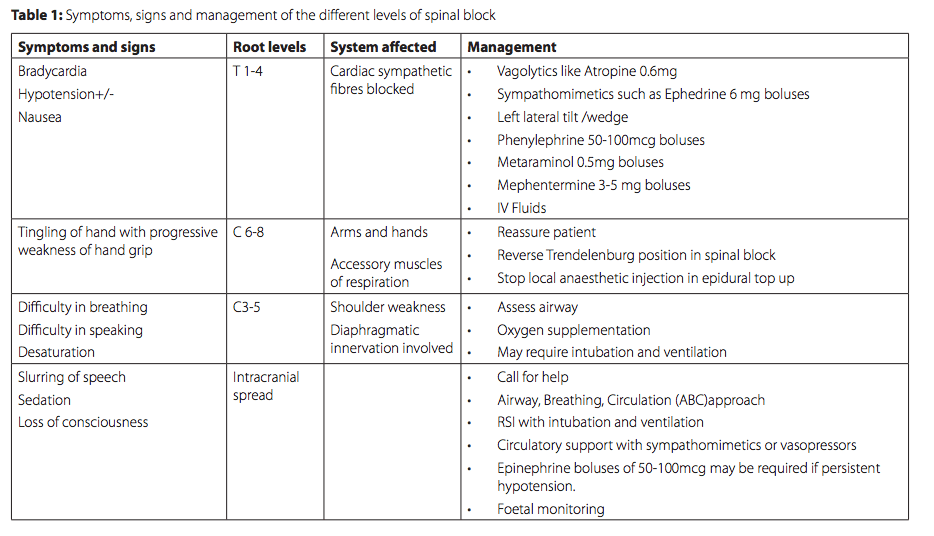 - Spinal dose after failed epidural —> expect high block, can also cause high spinal: sometimes hoarseness first, can progress to LOC requiring ETT. Will have profound HOTN —> pressors