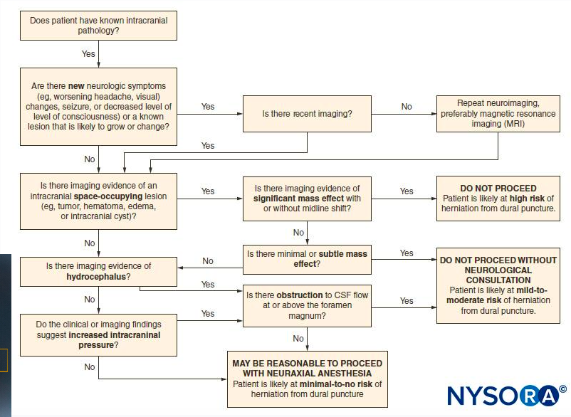 - Pseudotumor cerebri usually ok, as well as chairi malformation type 1, as long as they don’t have s/s ^^ICP (see NYSORA ICP & Neuraxial flowchart below)